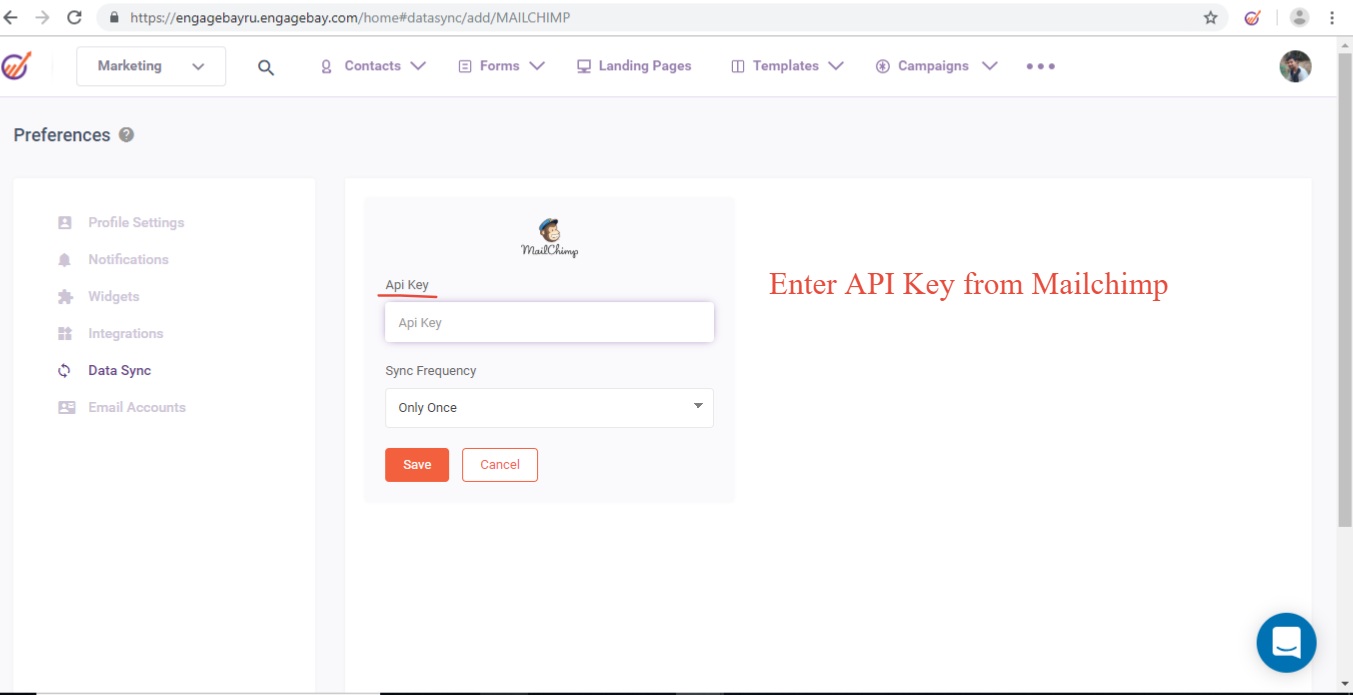 This native integration allows you to sync all Lists , contacts, tags & custom Fields From Mailchimp into EngageBay. It can be set up using the Api key you can find in your mailchimp account. You can find this option under Data Sync (Account avatar>> Preferences >> Data Sync ).