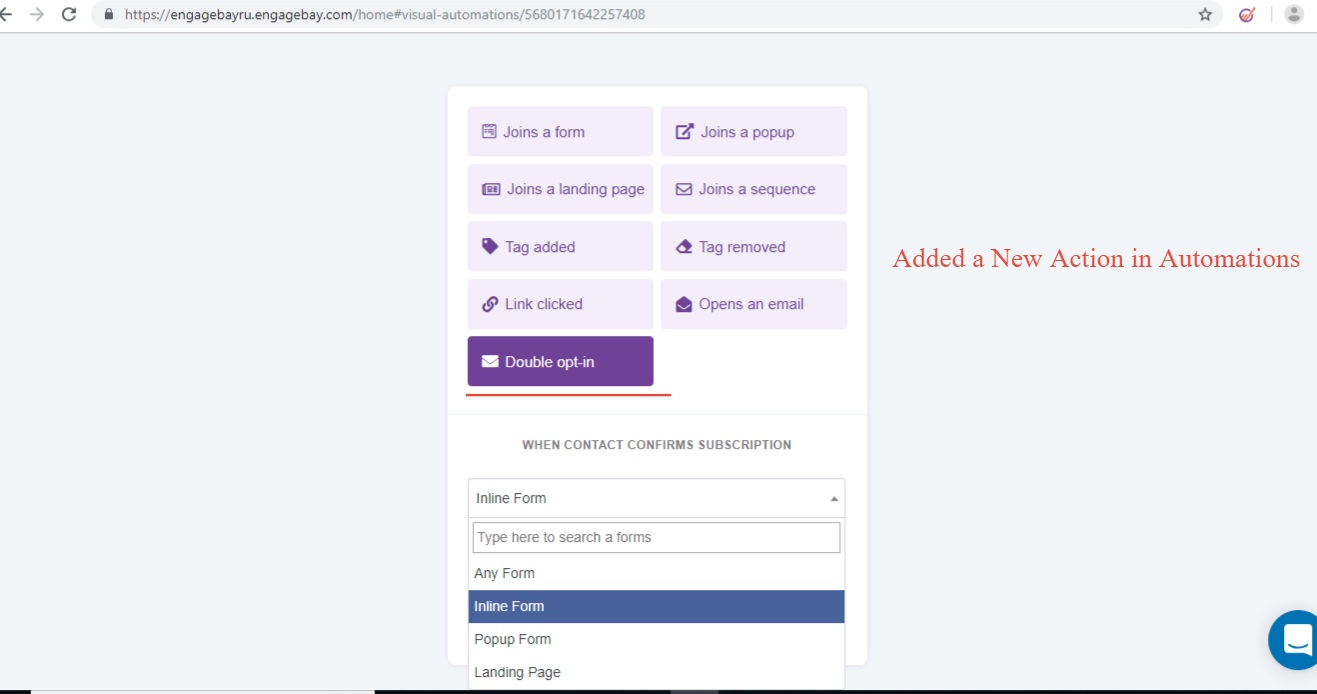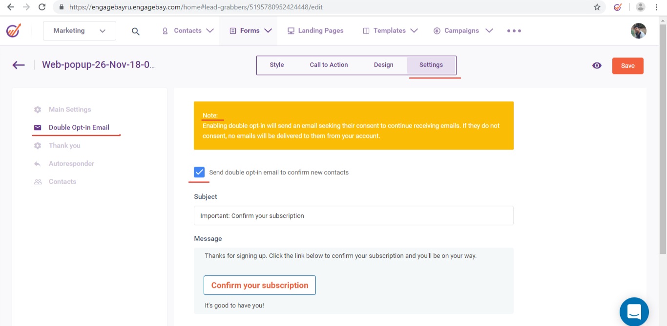 2. An alert info will show when Double Opt-in is enabled in settings of an Inline Forms, Landing Pages or Web Pop-up: