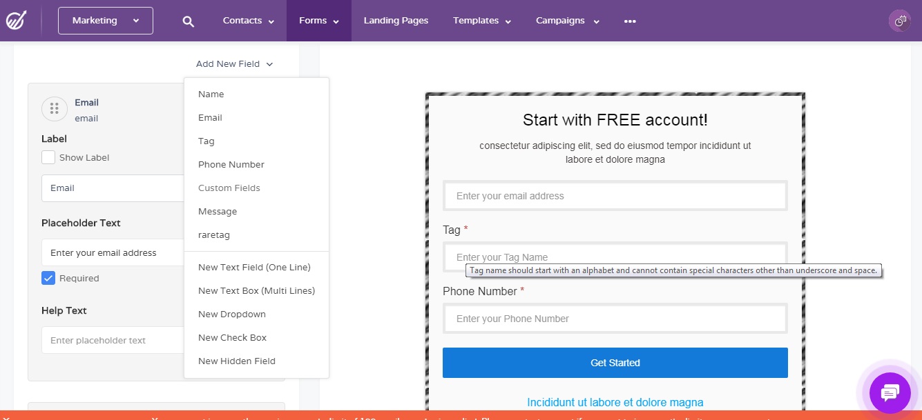 Parameters are set for TAG and phone number so that only valid entries will be accepted.