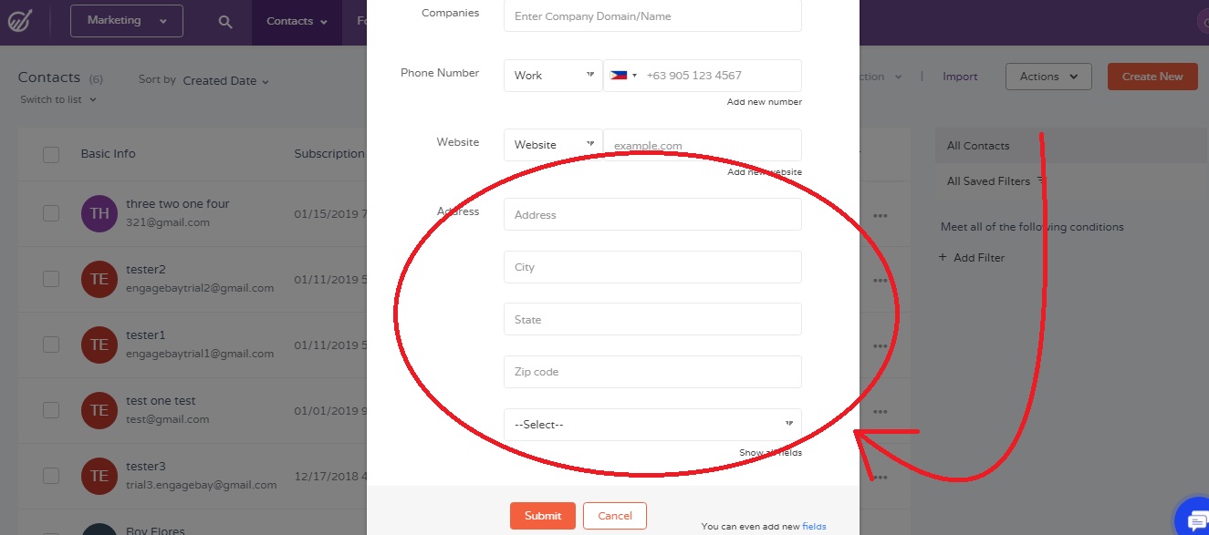 Added Address fields (Type + Address + City + State + Zip + Country)..